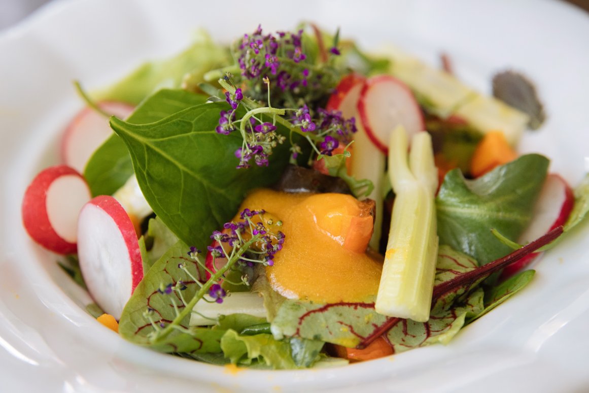 - 3. Omyté a osušené listy salátu dejte do talíře. Ředkvičky a celer nakrájejte na plátky a rozložte na salát. Lehce zchladlou pečenou dýni přidejte také a polijte dýňovou zálivkou. Posypte nasekanými čerstvými bylinkami nebo jedlými květy a jezte.